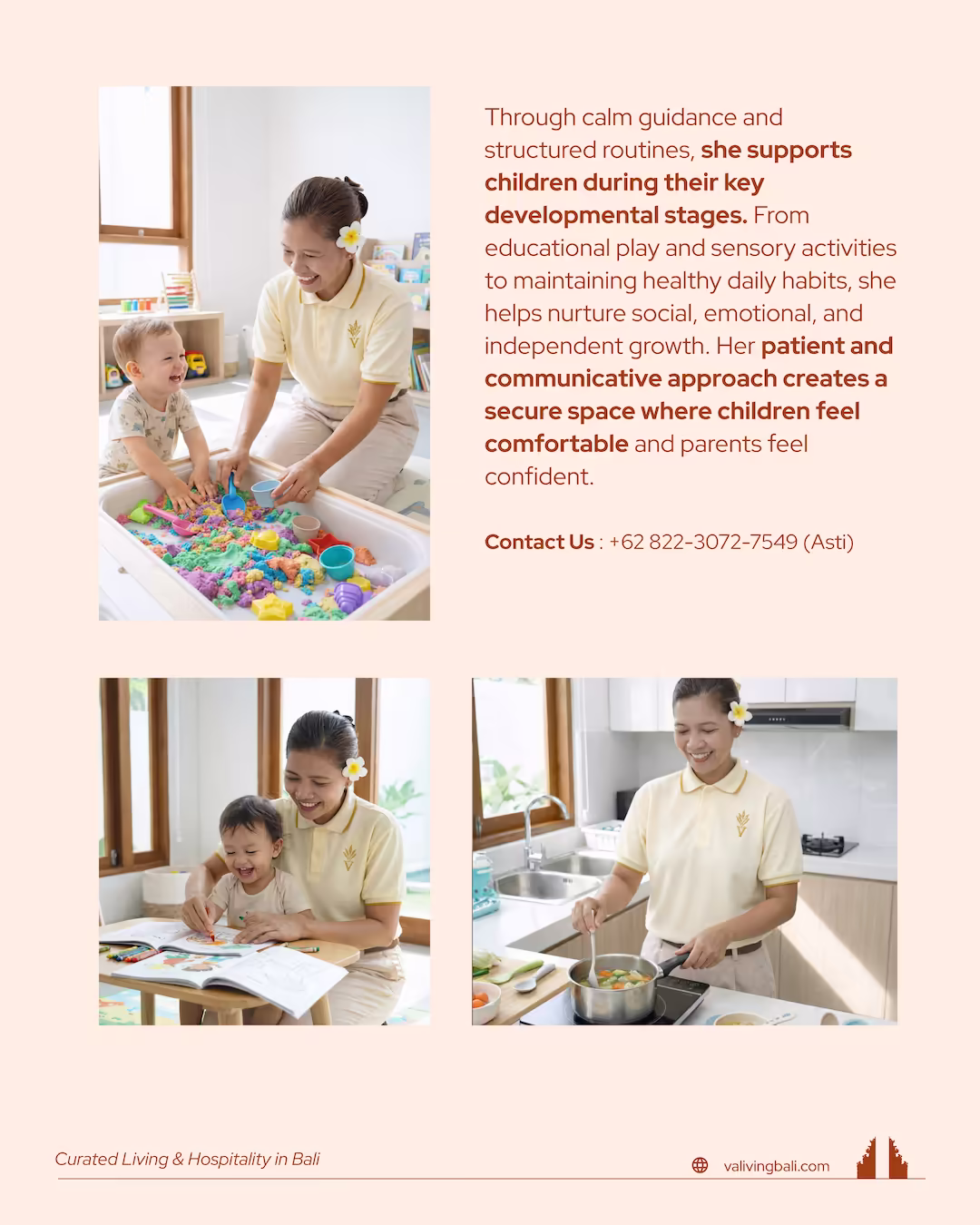 Eka Ayu Purama Lestari is a nurturing and education-focused nanny with a strong background in early childhood education. With over 10 years of experience as a teacher and additional experience in daycare, she brings a structured, attentive, and development-oriented approach to child care.