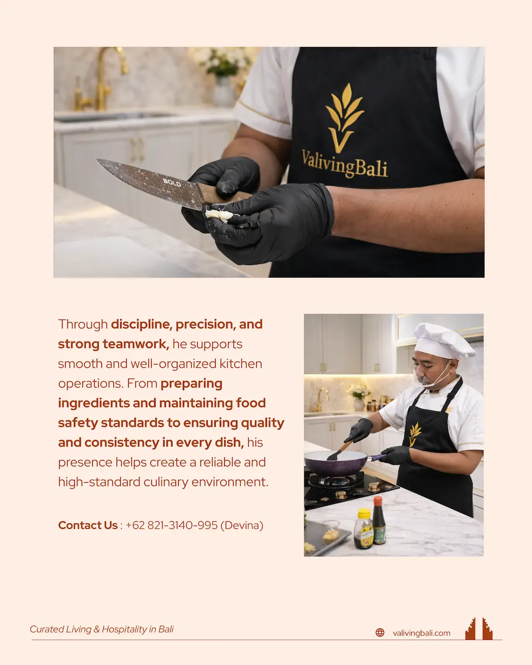 He is experienced in maintaining food quality, managing stock, and working in fast-paced environments while upholding strict hygiene and safety practices, making him well-suited for both private villas and professional kitchens.